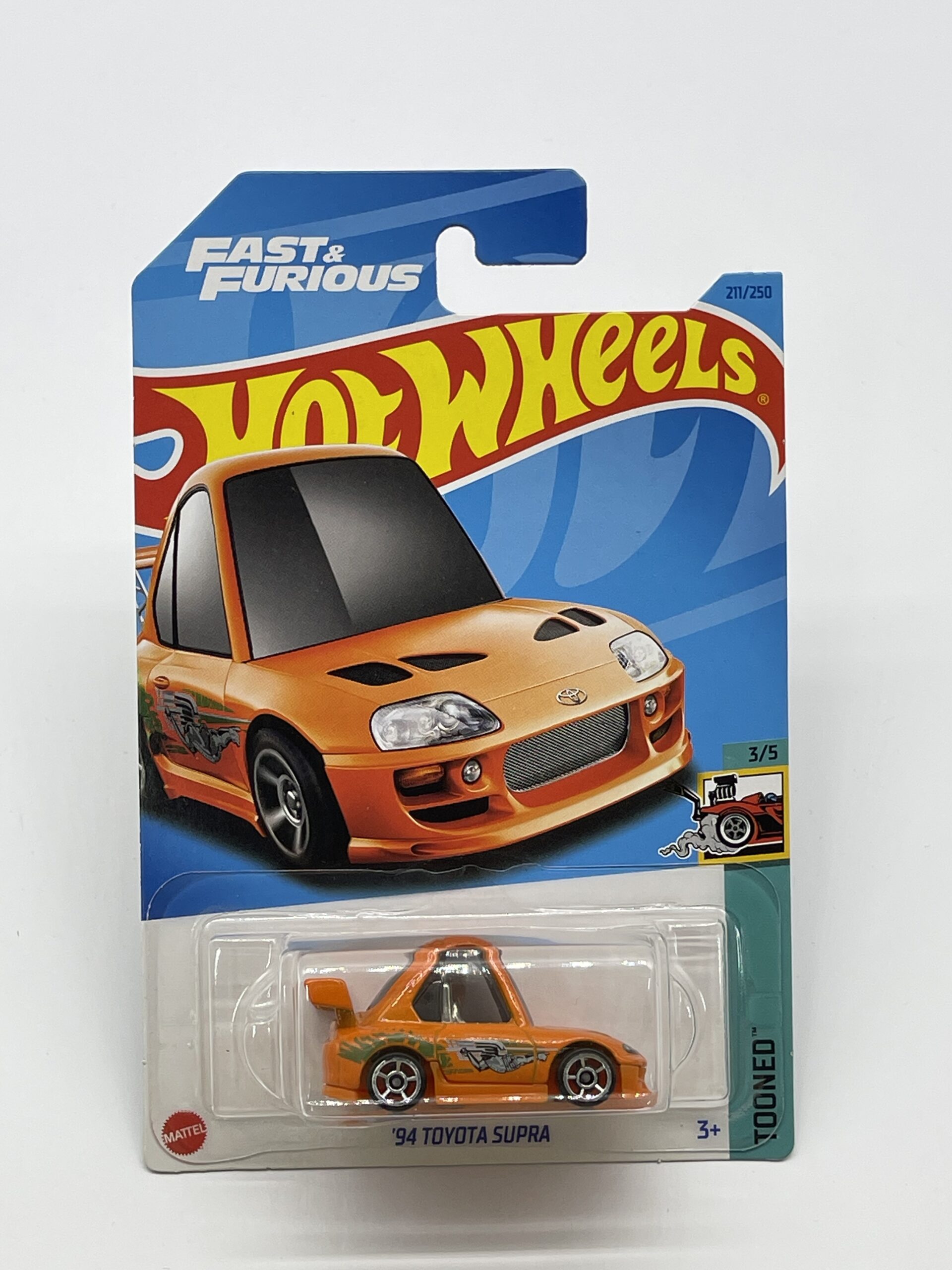 Capture the high-octane spirit of the Fast & Furious saga with this Hot Wheels 2023 ’94 Toyota Supra #211/250 from the Tooned series. A must-have for collectors and enthusiasts, this 1:64 scale diecast model boasts meticulous detailing that mirrors the iconic orange 1994 Supra, synonymous with speed and performance. The toy car fits seamlessly into any Fast & Furious themed collection and is designed for avid fans aged 3 and above. Whether it’s for display or for recreating car chase scenes, this Hot Wheels Toyota Supra is a thrilling addition to any diecast vehicle assortment.