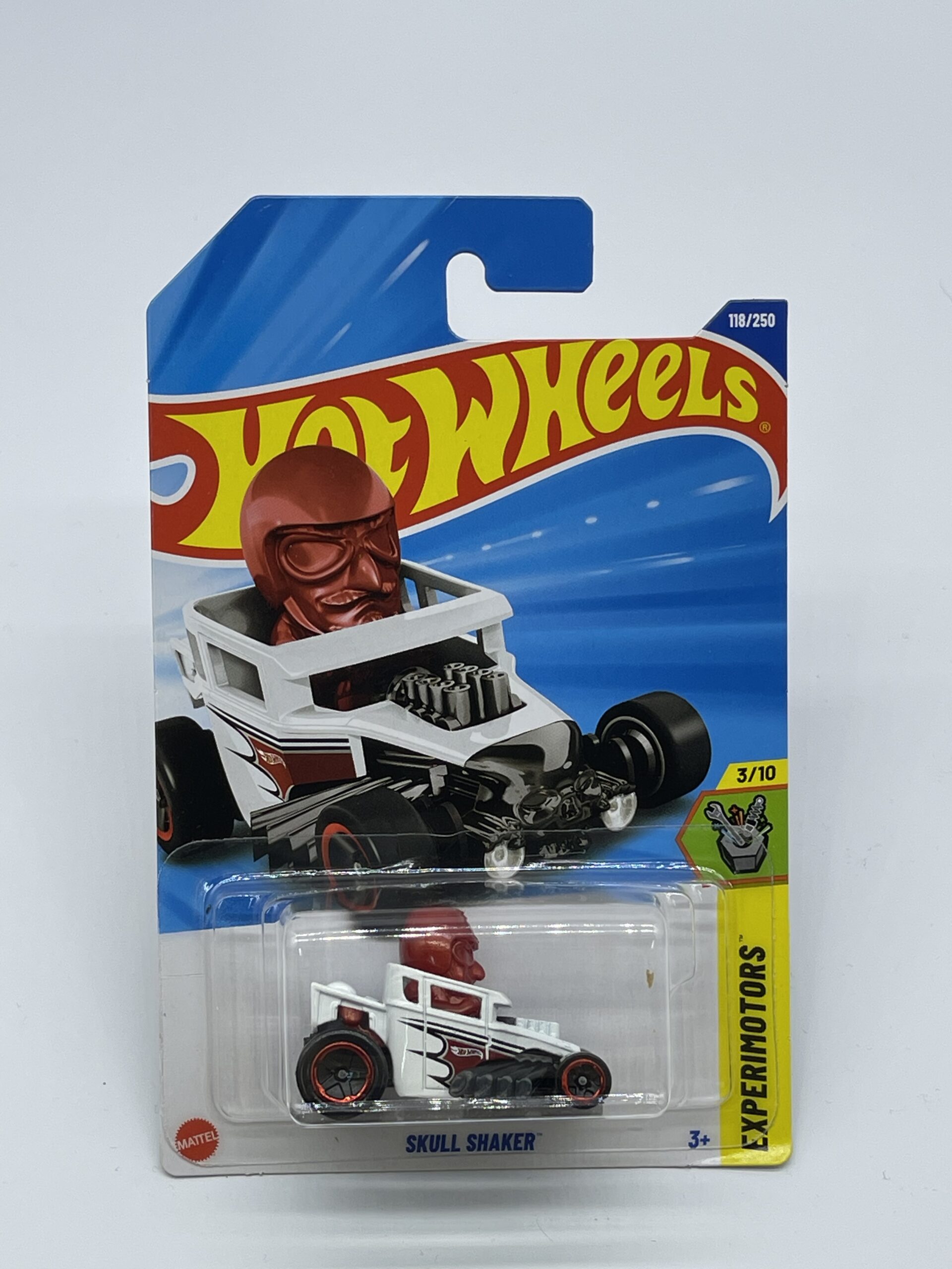 Explore the unique realm of fantasy with the Hot Wheels Skull Shaker from the Experimotors series, a 1:64 scale diecast model that captures the imagination of collectors and enthusiasts alike. The striking white, red, and black Skull Shaker Car, with its custom Hot Wheels skull theme, epitomises the spirit of Hot Rods and custom cars, making it a standout piece in any collection. Crafted with meticulous attention to detail, this model, number 118 in the series, is suitable for ages 3 and up, transcending generations. Whether for play or display, this collectible car, sealed and carded, celebrates the legacy of Hot Wheels and is a must-have for those who appreciate the artistry behind diecast vehicles.